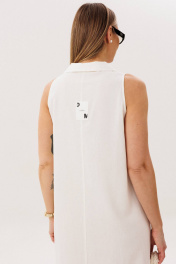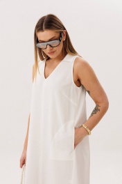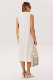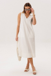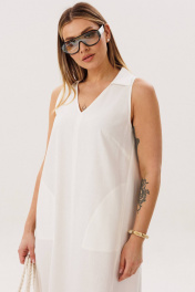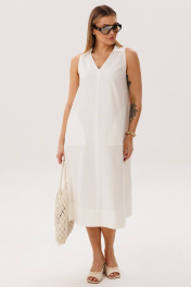 Льняное платье-это про натуральность и комфорт. Оно идеально для жарких дней, выглядит обворожительно и наряду с этим крайне удобно и красиво. Свободный А-силуэт, английская пройма, V-образный вырез, воротник, фигурная линия низа. Полочка с центральным швом, боковыми рельефами с фигурными карманами. Спинка со средним швом, боковыми рельефами и эффектной нашивкой. Особую привлекательность модели придает широкая подгибка низа. Длина платья около 117 см.