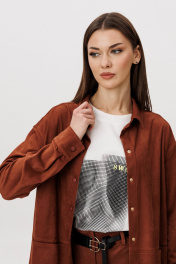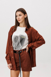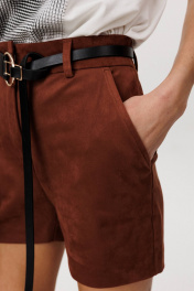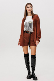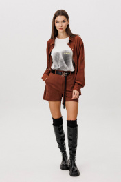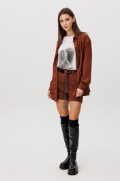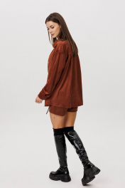 Замша уже несколько сезонов подряд удерживает статус одного из главных трендов. Для тех кто следит за модными новостями, это неудивительно: эта благородная фактура стала основой большинства модных дизайнерских коллекций. Эффектная, она органично вписывается в самые разные образы. Образ, который говорит сам за себя, смелый и дерзкий, и в то же время очень комфортный. Рубашка из замши-нестандартная, но стильная альтернатива куртке, но на более теплую погоду. Свободный, расслабленный силуэт, рубашечный покрой, центральная застежка на кнопки. Полочка с горизонтальным членением ниже линии талии и карманом в шве. Спинка с отрезной кокеткой и мягкими складками. Рукав с локтевым швом, разрезом в нем, мягкой складкой и притачной манжетой по низу. Низ изделия-фигурный. Воротник-классический рубашечный. Шорты-это просто ""masthave"" осеннего сезона, с лоферами или казаками, с модными сапогами трубами, с носками или гольфами-это всегда эффектно подчеркивает вашу свободу, независимость и индивидуальность. Шорты на притачном поясе со шлевками, эластичном в области спинки. Передние половинки-с наклонным боковым карманом. Задние половинки шорт с талиевой вытачкой. Длина рубашки около 75 см. Длина рукава с плечом около 74 см. Длина шорт около 35 см. Пояс в комплект не входит