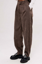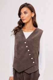 Костюм с жилетом - прекрасное решение для смелых экспериментов. Жилет полуприлегающего силуэта с асимметричной застёжкой, фигурной линией низа и регулирующийся кулисе по спинке. Полочки с отрезным бочком и нагрудными вытачками, спинки - с центральным швом, отрезным бочком и регулирующийся кулисой с фиксаторами. Брюки "баррел" на притачном поясе со шлёвками (эластичном в области спинки), с наклонными карманами , мягкими складками защипами по верху брюк и вытачками по низу. Джемпер трикотажный, с длинным рукавом, полуприлегающего силуэта.