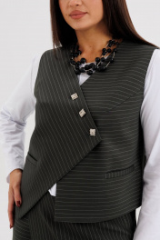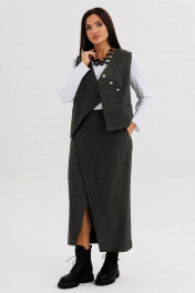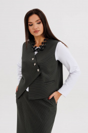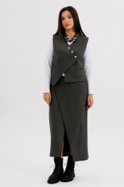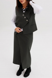 Стильный женский костюм в полоску — идеальное сочетание элегантности и современного минимализма. Комплект состоит из жилета оригинального кроя с асимметричной застёжкой, прямой юбки миди с мягким запахом и джемпера с длинным рукавом. Модель выполнена из плотной трикотажной ткани с тонкой вертикальной полоской, которая визуально вытягивает силуэт и подчёркивает стройность. Жилет без рукавов застёгивается на декоративные пуговицы, создавая выразительный акцент в образе. Юбка миди с запахом добавляет женственности и комфорта при движении. Джемпер трикотажный, с длинным рукавом, полуприлегающего силуэта. Костюм легко комбинируется с базовыми лонгсливами, водолазками или блузками, подходит для офиса, деловых встреч и городских образов. Особенности модели: Комплект: жилет + юбка миди, джемпер. Принт: тонкая вертикальная полоска Асимметричная застёжка на пуговицы Прямой крой и лаконичный дизайн Комфортная посадка и универсальный стиль