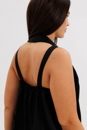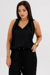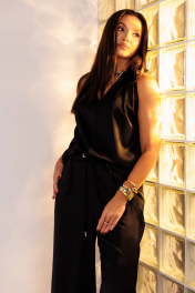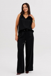 Элегантная брючная двойка, в которой комфорт гармонично сочетается с чувством стиля. Эффектный топ с V-образным вырезом и воротником-холтер мягко драпируется от линии плеч, создавая женственный силуэт и лёгкий акцент на зону декольте. Брюки свободного покроя на эластичном поясе со шнуром-завязкой и металлическими люверсами придают образу расслабленную изысканность и ощущение непринуждённого шика. Такой комплект — универсальное решение для современных женщин, которые ценят стиль, удобство и элегантность в каждом движении. Он будет уместен и в офисе с жакетом, и на вечернем выходе с яркими аксессуарами.