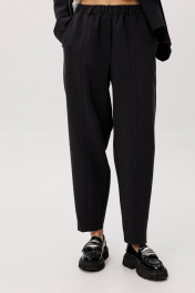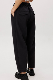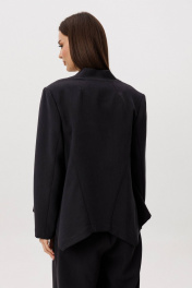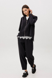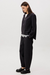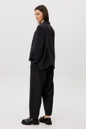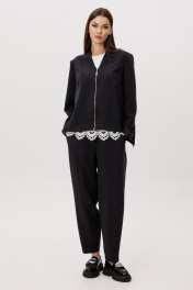 Современный костюм-тройка, в котором минимализм сочетается с продуманными дизайнерскими деталями. Жакет прямого силуэта выполнен со сложной архитектурной спинкой, создающей выразительный объём и подчёркивающей концептуальный характер модели. Застёжка на молнию добавляет образу графичность и современное звучание. Расслабленные брюки-бананы с мягкой линией кроя обеспечивают комфорт и формируют актуальный силуэт с лёгким акцентом на талии. Хлопчатобумажный топ, декорированный изящным кружевом по нижнему краю, добавляет образу контрастную женственность и завершённость. Костюм легко адаптируется под разные стилистические сценарии — от повседневного city-look до интеллектуального casual с акцентом на форму и фактуру.