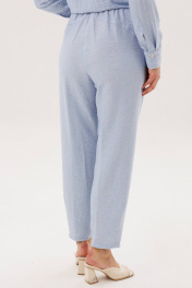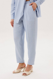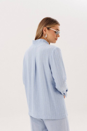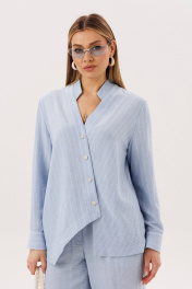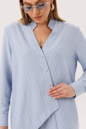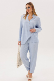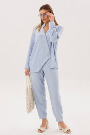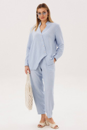 Лёгкий и элегантный брючный комплект в нежном голубом оттенке — идеальный выбор для тёплого сезона. Современный крой и натуральные фактуры создают гармоничный образ, сочетающий комфорт и утончённый стиль. В комплект входит: Рубашка свободного кроя в тонкую вертикальную полоску Однотонные брюки с комфортной посадкой Рубашка выполнена из смесового полотна с добавлением льна, что обеспечивает отличную воздухопроницаемость и лёгкость. Тонкая полоска визуально вытягивает силуэт, а асимметричная линия низа и аккуратный ворот придают модели современный характер. Брюки лаконичного дизайна уравновешивают верх и делают комплект универсальным. Свободный крой и мягкая посадка обеспечивают комфорт и свободу движений в течение всего дня. Преимущества комплекта: натуральные волокна в составе (лён + смесовая ткань) лёгкость и комфорт в тёплую погоду актуальное сочетание полоски и однотонной базы универсальность для повседневных и деловых образов Комплект легко комбинируется с сандалиями, мюлями или кедами, позволяя создавать как расслабленные, так и более собранные образы. Идеальный выбор для тех, кто ценит натуральные ткани, комфорт и современную элегантность.