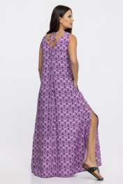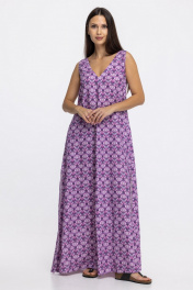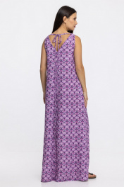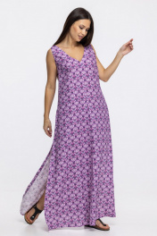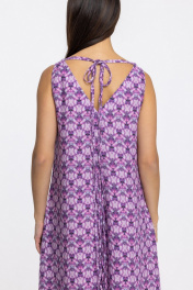 Летнее женское платье свободного кроя А-образного силуэта с карманами в боковых швах. Треугольный вырез горловины спереди и по спинке. Боковые швы оканчиваются разрезами на юбке. По спинке выполнены длинные декоративные завязки