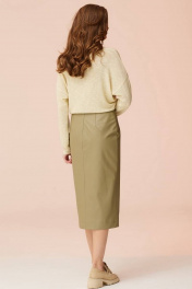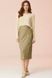Комплектация: джемпер, юбка Тип ткани: трикотаж, экокожа Силуэт:джемпер- свободный, юбка-прямой Длина джемпера по спинке: 64 cм, длина рукава от горловины-77 см, рукав спущенный. Длина юбки:80 см. Дополнительное описание: джемпер с фигурным вырезом горловины и спущенной линией плеча. Юбка разрезная по переду, со шлицей и кнопками в шве. Пояс притачной, частично на резинке. В среднем шве заднего полотнища юбки- потайная застежка- молния. Юбка на подкладке.
