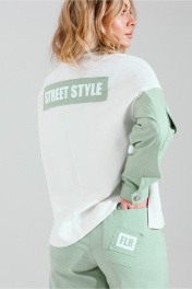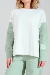 Силуэт: Свободный. Вырез горловины: округлый. Декоративные элементы: печать. Джемпер из комбинации двух видов ткани- трикотажа и джинса. Рукав спущенный, с декоративными нашивками по рукавам и спинке. Брюки из джинсовой ткани,с карманами и поясом частично на резинке.