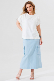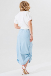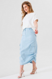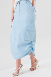 Юбка из джинсовой ткани, слегка расширенная книзу, со средним швом и накладными карманами спереди и сзади. В боковом шве юбки- кулиса на резинке с фиксатором. Пояс юбки частично на резинке. Длина юбки- 81см.