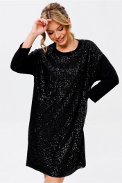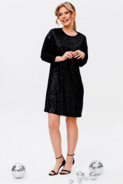 Силуэт: прямой. Вырез горловины: округлый. Длина изделия: по спинке - 95см. Длина рукава: от горловины 63см, рукав спущенный. Полочка изделия двухслойная, из атласной ткани с верхним слоем из пайеток на сетке. Спинка и рукава платья изготовлены из французского трикотажа.