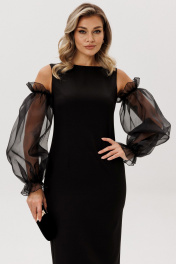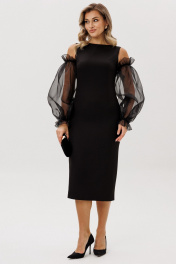 Элегантное женское платье прилегающего силуэта, длиной ниже колена. По переду- талиевые вытачки, переходящие в рельеф. Спинка со средним швом, в котором обработаны разрез в виде капельки с петлей и пуговицей, потайная молния и шлица внизу. Горловина в виде лодочки. В комплект входят съемные рукава из органзы. Декоративные элементы: съемные рукава из тафты