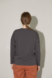 Джемпер прямого силуэта, зауженный книзу. Длина на уровне бёдер .Рукав рубашечный длинный, зауженный книзу, с заниженной линией плеча. Джемпер имеет V-образный вырез, по переду обработанный притачными планками шириной 5,0см .