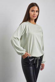 Женский легкий джемпер со сборкой по низу прямого силуэта длиной до линии бедер. Рукав-реглан со спущенным плечем помогает сделать образ расслабленным и мягким, а тонкие манжеты на запястьях и круглой горловине создают дополнительный комфорт.