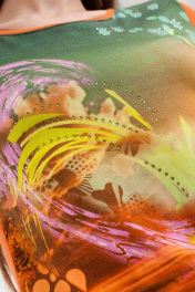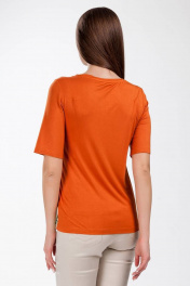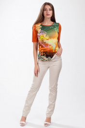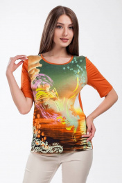 Прямой джемпер с рукавом до локтя и трансфером из страз.Длина до уровня бедер.Рукав короткий втачной.Вырез горловины круглый c отделочной строчкой на 0,1см.Спинка, рукава и бейки по горловине из однотонной ткани.Женские майки с принтом всегда приятно дополняют образ и делают его интересным и стильным.