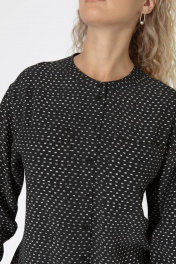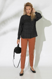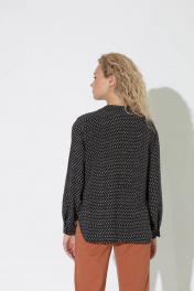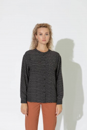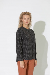 Блузка свободного силуэта длиной до линии бедер. Джемпер с центральной застежкой на планку петли и пуговицы и двумя накладными карманами.Рукав рубашечный, длинный с манжетой по низу шириной 6-7 см и застежкой на петлю и пуговицу.Стильная классическая блузка, которую можно надеть, как в офис, так и на праздничное мероприятие.