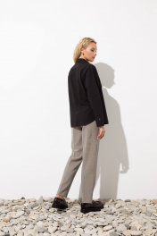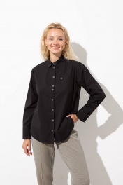 Черная блузка-рубашка с длинными рукавами позволит сделать офисный образ интересным. Такая модель универсальна и подходит для осени, весны и прохладного лета. Рубашка застегивается спереди на пуговицы и имеет стояче-отложной воротник Спереди имеется асимметричный накладной карман с декоративной строчкой и пуговицей. Рукав у модели длинный со сборкой по шву и манжетой с декоративной строчкой и пуговицей.У блузки фигурный низ, поэтому ее можно носить навыпуск.Блузка приятная к телу и на ощупь, хорошо носится, не выгорает на солнце, хорошо сохраняет цвета, легко стирается, быстро сохнет, не требует специального ухода.