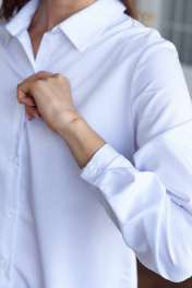 Блузка рубашечного кроя свободного силуэта длиной ниже линии бедер. Спереди застежка на пуговицы.Рукав длинный, рубашечный с манжетой по низу шириной 4 см и застежкой на пуговицу. Воротник стояче-отложной. Легкая струящаяся блуза станет приятным дополнением вашего офисного или повседневного лука.