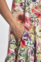 Это летнее платье миди ,расширенного книзу силуэта, эффектно выглядит благодаря цветочному принту и сборки спереди, имитирующий волан снизу. Сзади у модели имитация застежки с пуговицами, а по бокам расположены карманы. Хлопоковое платье обеспечивает воздухопроницаемость и позволяет телу дышать, что очень важно в жаркое время года. При этом материал выглядит очень элегантно и привлекательно. Кроме того, летнее платье имеет " А " силуэт, который подчеркнет Вашу фигуру, но не будет сковывать движения.Оно станет прекрасным дополнением к Вашей гардеробной коллекции и позволит Вам выглядеть стильно и модно в летнее время года.