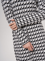 Эффектное современное дизайнерское женское платье. В основу данного изделия заложен разработанный дизайнерами принт, гусиная лапка, который продолжает оставаться актуальным в современной моде. Это один из немногих классических принтов, который считается идеальным для создания деловых образов. Для образа подойдут яркие однотонные аксессуары в качестве дополнения к аутфиту, для любителей сбалансированных монохромных образов, аксессуары в черном и белом цвете. Подчеркнет особенность женской фигуры и позволит выделиться из толпы. Горловина изделия обработана однотонным черным кантом, который создает эффект украшения. Рукава изделия декорированы узкими однотоными черными манжетами. Деталь, которая придает данной модели утонченность и завершенность. Платье выполнено в длине миди, в полуприлегающем силуэте. Грамотно подобранный состав ткани, позволяет изделию дышать, несмотря на плотность самого трикотажа и сохранять форму длительное время.