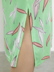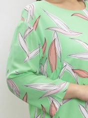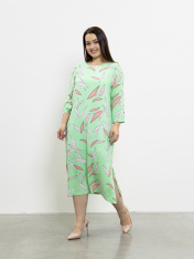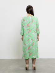 Яркое платье из тонкой вискозной ткани с нанесением принта в стиле "таи-дай". Платье прямого силуэта, немного расширенное книзу с разрезами по бокам. Рукав рубашечный прямой со спущенной линией плеча, длинной 3/4. На подкладке.