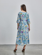 Силуэт платья свободный. Выше линии талии фигурный подрез, юбка присобрана по кругу. Спущенный рукав ниже локтя. Платье без подкладки. Платье выполнено из 100% рэвона (улучшенной вискозы) с сочным цветочным принтом.