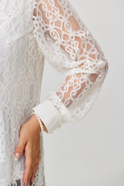 Женская блузка "ЮТА" из легкой нежной кружевной ткани, на трикотажной подкладке. Блузка прямого силуэта, по полочке нагрудная выточка из проймы. Рукав втачной, по низу рукава манжет на петлю и пуговицу. Застежка обработана отрезной планкой из атласной ткани на петли и пуговицы. Воротник в блузке из атласной ткани, рубашечного типа на стойке. Низ блузки обработан на распошивалку. Нарядная и эффектная блузка подойдет как наряд на свадьбу, день рождения, новый год.