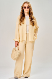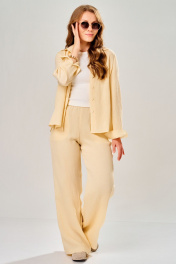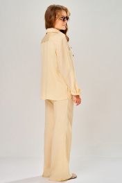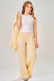 Женский брючный комплект ""Магрита"" выполнен из текстильной ткани ""Нотус"" и состоит из брюк и рубашки. Этот комплект выполнен из натуральных тканей (хлопка и льна), а также для эффекта создания легких полосочек используется во составе нейлон. Рубашка прямого силуэта, застежка однобортная на петли и пуговицы. Воротник рубашечного типа со стойкой. По спинке рубашки отрезная кокетка, рукава втачные одношовные, по низу рукава манжета с застежкой на петлю и пуговицу. Низ изделия обработан швом в подгибку с открытым срезом. Брюки свободные, прямого силуэта. Пояс цельнокроеный на резинке, в боковых швах - карманы. Низ брюк обработан швом в подгибку с открытым срезом.