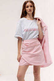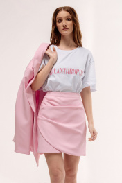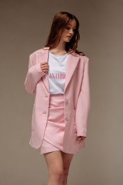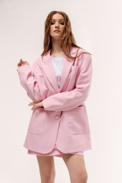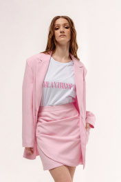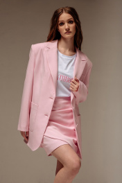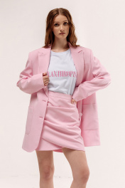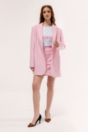 Костюм двойка жакет с укороченной юбкой в розовом цвете. Жакет свободного кроя. Характеристики: выполнен из костюмной ткани в розовом цвете, однобортная застежка на петли и пуговицы, жакет на подкладке, накладные карманы по полочкам, по спинке разрез-шлица, рукава двухшовные. Длина жакета по переду 83 см, длина рукава 63,5 см. Юбка А-силуэта. Характеристики: по переду два кармана в рельефах, выполнена из костюмной ткани в оранжевом цвете, юбка на подкладке, застежка-молния по заднему полотнищу юбки, верх юбки обработан поясом-обтачкой. Длина юбки 46,5 см.