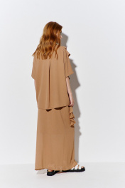 Комплект: рубашка и юбка. Рубашка свободного силуэта, выполнена из рубашечной ткани в карамельном цвете, центральная застежка на петли и пуговицы, по полочкам декоративный элемент ввиде воланов, по спинке отрезная кокетка и складка. Длина рубашки по переду 76 см, длина рукава 17 см. Юбка прямого силуэта в длине макси, выполнена из шифона-крэш в карамельном цвете, юбка на подкладке, пояс обработан эластичной тесьмой (резинкой). Длина юбки по боковому шву 100 см.