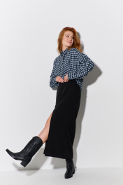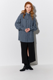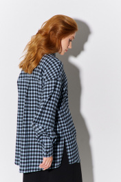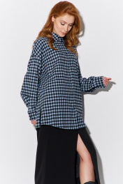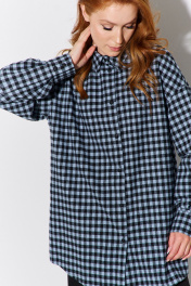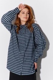 Рубашка оверсайз в клетку. Характеристики: свободный силуэт, выполнена из фланеливой рубашечной ткани в черно-голубую клетку, центральная застежка на петли и пуговицы, по спинке отрезная кокетка и складка, низ рукава обработан манжетой на петли и пуговицы. Длина рубашки по переду 79,5 см, длина рукава 55,5 см.