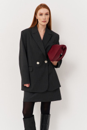 Жакет свободного кроя. Характеристики: выполнен из костюмной ткани в серо-графитовом цвете, двубортная застежка на петли и пуговицы, жакет на подкладке, функциональные карманы с клапаном, нагрудный карман-иммитация, по спинке разрез-шлица, рукава двухшовные. Длина жакета по переду 79 см, длина рукава 63 см.