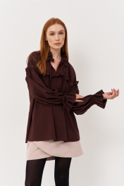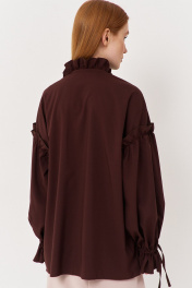 Блузка свободного кроя. Характеристики: выполнена из блузочной ткани в коричневом цвете, по горловине и кокетке сборка с рюшами, рукав свободный со сборкой по окату и кулисой по манжету. Длина рубашки по переду 73 см, длина рукава 48 см.