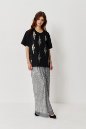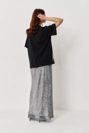 Юбка прямого силуэта в длине макси. Характеристики: выполнена из паеточной ткани в цвете серебро, пояс обработан эластичной тесьмой (резинкой). Длина юбки по боковому шву 110 см.