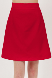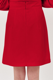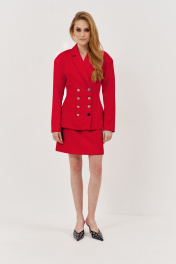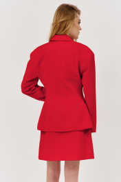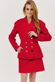 Костюм жакет с юбкой. Жакет приталенного кроя со спущенным плечом. Характеристики: выполнен из костюмной ткани в красном цвете, двубортная застежка на петли и пуговицы, жакет на подкладке, функциональные карманы с листочкой, рукава двухшовные. Длина жакета по переду 69 см, длина рукава 57 см. Юбка мини на подкладке А-силуэта выполнена из костюмной ткани в красном цвете, застежка-молния по заднему полотнищу юбки, верх юбки обработан поясом-обтачкой. Длина юбки 50 см.