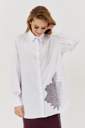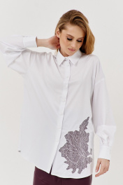 Рубашка свободного силуэта с вышивкой по переду. Характеристики: выполнена из рубашечной ткани в белом цвете, по переду декоративная вышивка, центральная застежка на петли и пуговицы, по спинке отрезная кокетка, низ рукава обработан манжетой на петли и пуговицы. Длина рубашки по переду 78 см, длина рукава 51 см.