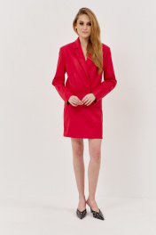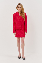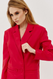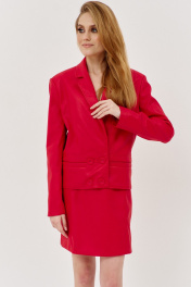 Комплект жакет с юбкой. Жакет прямого кроя на подкладке. Характеристики: выполнен из искусственной кожи в красном цвете, двубортная застежка, по переду карманы с листочкой, рукава двухшовные, по низу жакета отрезная кокетка. Длина жакета по переду 60 см, длина рукава 62,5 см. Юбка на подкладке прямого силуэта с рельефами по переду выполнена из искусственной кожи в красном цвете, застежка-молния по заднему полотнищу юбки, верх юбки обработан поясом-обтачкой. Длина юбки 49 см.