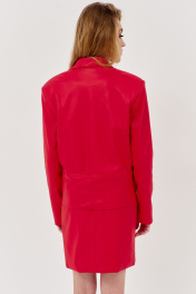 Комплект жакет с юбкой. Жакет прямого кроя на подкладке. Характеристики: выполнен из искусственной кожи в красном цвете, двубортная застежка, по переду карманы с листочкой, рукава двухшовные, по низу жакета отрезная кокетка. Длина жакета по переду 60 см, длина рукава 62,5 см.
