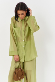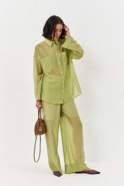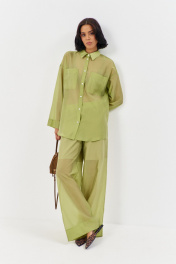 Комплект блузка с брюками. Блузка свободного силуэта с карманами по переду. Характеристики: выполнена из блузочной ткани в цвете фисташки, центральная застежка на петли и пуговицы, по спинке отрезная кокетка. Длина рубашки по переду 79 см, длина рукава 53 см. Брюки прямого силуэта на подкладке. Выполнены из блузочной ткани в цвете фисташки. Пояс брюк на резинке с завязками. Длина брюк 112 см.