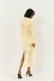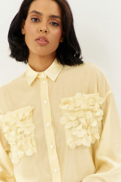 Комплект блузка с юбкой. Блузка свободного силуэта с декоративными карманами по переду. Характеристики: выполнена из блузочной ткани в цвете сливочное масло, центральная застежка на петли и пуговицы, по переду карманы с декоративными цветами, по спинке отрезная кокетка. Длина рубашки по переду 79 см, длина рукава 53 см. Юбка выполнена из блузочной ткани в цвете сливочное масло, пояс обработан эластичной тесьмой (резинкой), по заднему полотнищу юбки обработан разрез. Длина юбки по боковому шву 95 см.