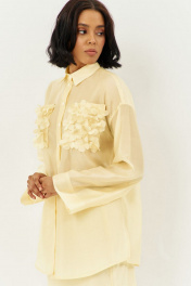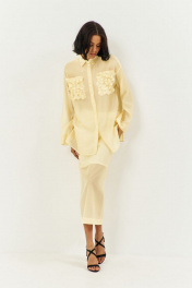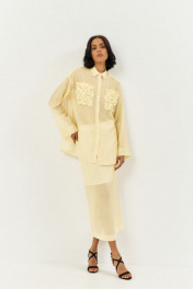 Юбка выполнена из блузочной ткани в цвете сливочное масло, пояс обработан эластичной тесьмой (резинкой), по заднему полотнищу юбки обработан разрез. Длина юбки по боковому шву 95 см.