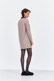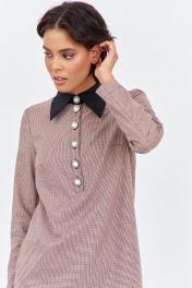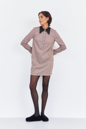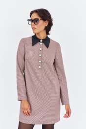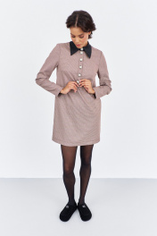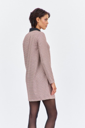 Платье прямого силуэта. Характеристики: выполнено из плательной ткани в принте "гусиная лапка" пыльно-розовая, воротник рубашечного типа в черном цвете, спинка разрезная на потайную застежку-молнию. Длина платья 87 см, длина рукава 62 см.