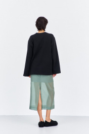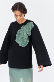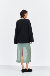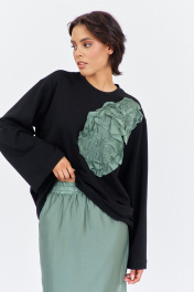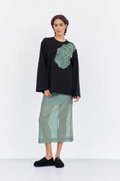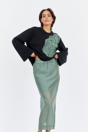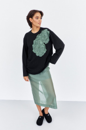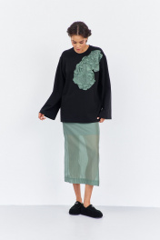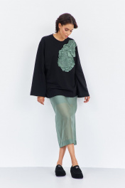 Комплект джемпер свободного силуэта со спущенным рукавом с юбкой. Характеристики: выполнена из трикотажного полотна в черном цвете, по переду декоративная вышивка, горловина обработана планкой, рукав прямой, спущенный. Длина джемпера по переду 74 см, длина рукава 60 см. Юбка выполнена из блузочной ткани в цвете зеленый мох, пояс обработан эластичной тесьмой (резинкой), по заднему полотнищу юбки обработан разрез. Длина юбки по боковому шву 95 см.