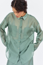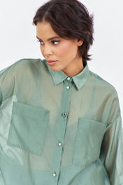 Блузка свободного силуэта с декоративными карманами по переду. Характеристики: выполнена из блузочной ткани в цвете зеленый мох, центральная застежка на петли и пуговицы, по переду карманы, по спинке отрезная кокетка. Длина рубашки по переду 79 см, длина рукава 53 см.