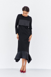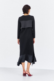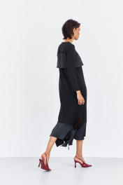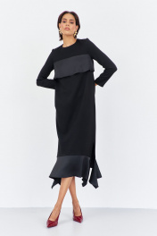 Платье прямого силуэта с воланами. Характеристики: выполнено из плательной ткани в черном цвете, по кокетке и низу платья декоративные воланы из атласной ткани, спинка разрезная на потайную застежку-молнию. Длина платья 128 см, длина рукава 58 см.