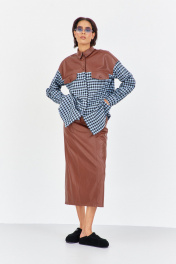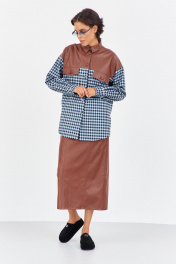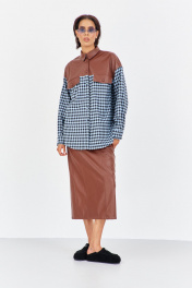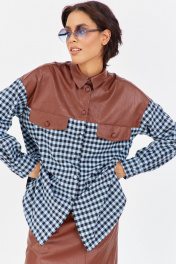 Рубашка в клетку с декоративными вставками из кожи. Характеристики: свободный силуэт, выполнена из фланелевой рубашечной ткани в черно-голубую клетку с кокеткаками, клапанами и воротником из кожи, центральная застежка на петли и пуговицы, по спинке отрезная кокетка и складка, низ рукава обработан манжетой на петли и пуговицы. Длина рубашки 80 см, длина рукава+плечо 78 см.