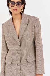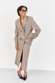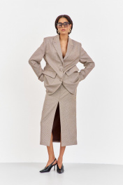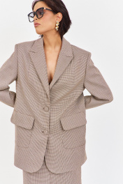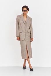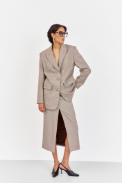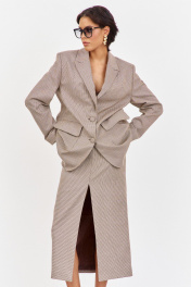 Костюм жакет с юбкой. Жакет свободного кроя. Характеристики: выполнен из костюмной ткани в принте"гусиная лапка" капучино, однобортная застежка на петли и пуговицы, жакет на подкладке, накладные карманы с клапанами, по спинке разрез-шлица, рукава двухшовные. Длина жакета по переду 81,5 см, длина рукава 63 см.