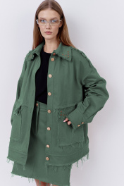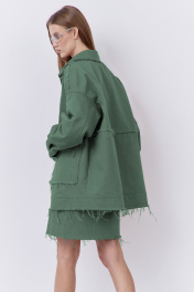 Джинсовый бомбер в цвете розовый кирпич. Характеристики: бомбер свободного силуэта выполнен из джинсовой ткани, центральная застежка на петли и пуговицы, по переду карманы с клапаном, низ рукавов и бомбера обработаны притачной манжетой, воротник рубашеного типа, по воротнику и клапанам клепки.
