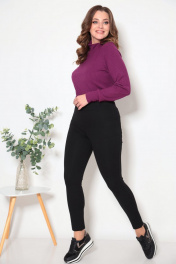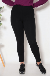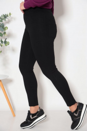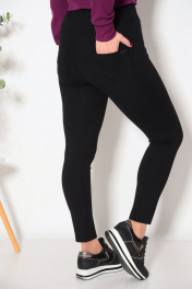 Леггинсы пошиты из трикотажа хорошего качества, приятного к телу, на притачном поясе со шлевками по верхнему срезу, собранном на резинку. На передних половинах имитация застежки-гульфика, подрезы от бокового шва в виде закруглённого кармана. На задних половинах кокетка и фигурные карманы с металлофурнитурой. Все швы отстрочены двойной отделочной строчкой.