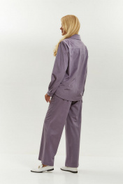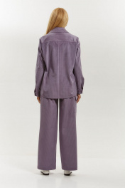 Костюм женский вельветовый, состоит из рубашки- жакета и брюк. Жакет имеет воротник рубашечного типа на стойке, центральную застёжку на петли пуговицы. Рукав двухшовный с застёжкой на манжете по низу. По переду имеется кокетка и настрочены накладные карманы с клапаном. Спинка имеет отрезную кокетку и средний шов. Низ жакета удлинён по центру и укорочен по бокам. Длина по спинке - 68 см, длина рукава – 61 см. Брюки прямого кроя, с застежкой на молнию, пояс с резинкой и петлей пуговицей. На правой половине брюк имеется накладной карман с клапаном. Длина брюк с поясом 107 см. Ширина по низу 29 см.