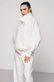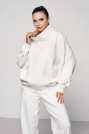 Спортивный женский костюм силуэта оверсайз, состоящий из бомбера на молнии и спортивных брюк, выполнен из высококачественного футера 3-х нитки класса "пенье". Лицевая сторона ткани гладная, изнанка - петлеобразная. Бомбер свободного силуэта с рукавами "летучая мышь" и функциональными карманами по переду застегивается на молнию. Низ бомбера и рукавов выполнены из трикотажного полотна в рубчик (резинка) "кашкорсе" в тон основной ткани. Брюки (спортивные штаны) свободного силуэта с функциональными карманами в боковых швах расширяются к низу, пояс брюк полностью на резинке.