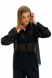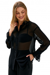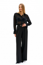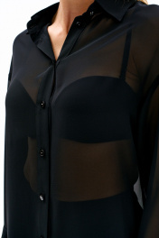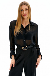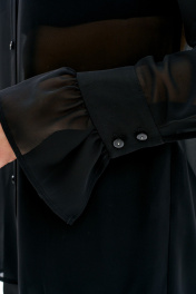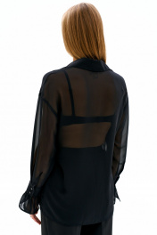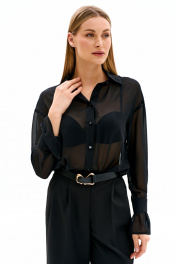 Женская лёгкая рубашка полуприлегающего силуэта выполнена из шифона. Рукава с манжетами и небольшой сборкой; воротник рубашечный; застёжка на петли и пуговицы. Рубашка полностью соответствует заявленному размеру. Пожалуйста, пользуйтесть таблицей обмеров готового изделия. Уход за изделиями из шифона: - стирать рекомендуется только вручную в теплой воде; - не рекомендуется использовать отжим; - сушить на горизонтальной поверхности; - хранить на плечиках.
