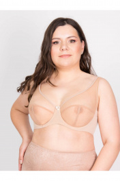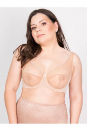 Бюстгальтер прозрачный с мягкой чашкой на каркасах, больших размеров. Изготовлен из сетчатого полотна. Чашка высокая закрытая, с дополнительными поддерживающими деталями по бокам. Бретели  широкие усиленные вставками из функциональной сетки. Бюстгальтер выполнен из прозрачного сетчатого полотна, края верха чашки обработаны окантовкой, декоративный бант на ластовице. Верхняя часть чашки однослойная (из прозрачной сетки), нижняя часть двухслойная. Чашка с Т-образным швом приподнимает, округляет и поддерживает грудь большого размера. U-образное расположение бретелей. Бретели из эластичной ленты с регулировкой по длине. Застёжка сзади на крючки и петли, 2*3 крючка.